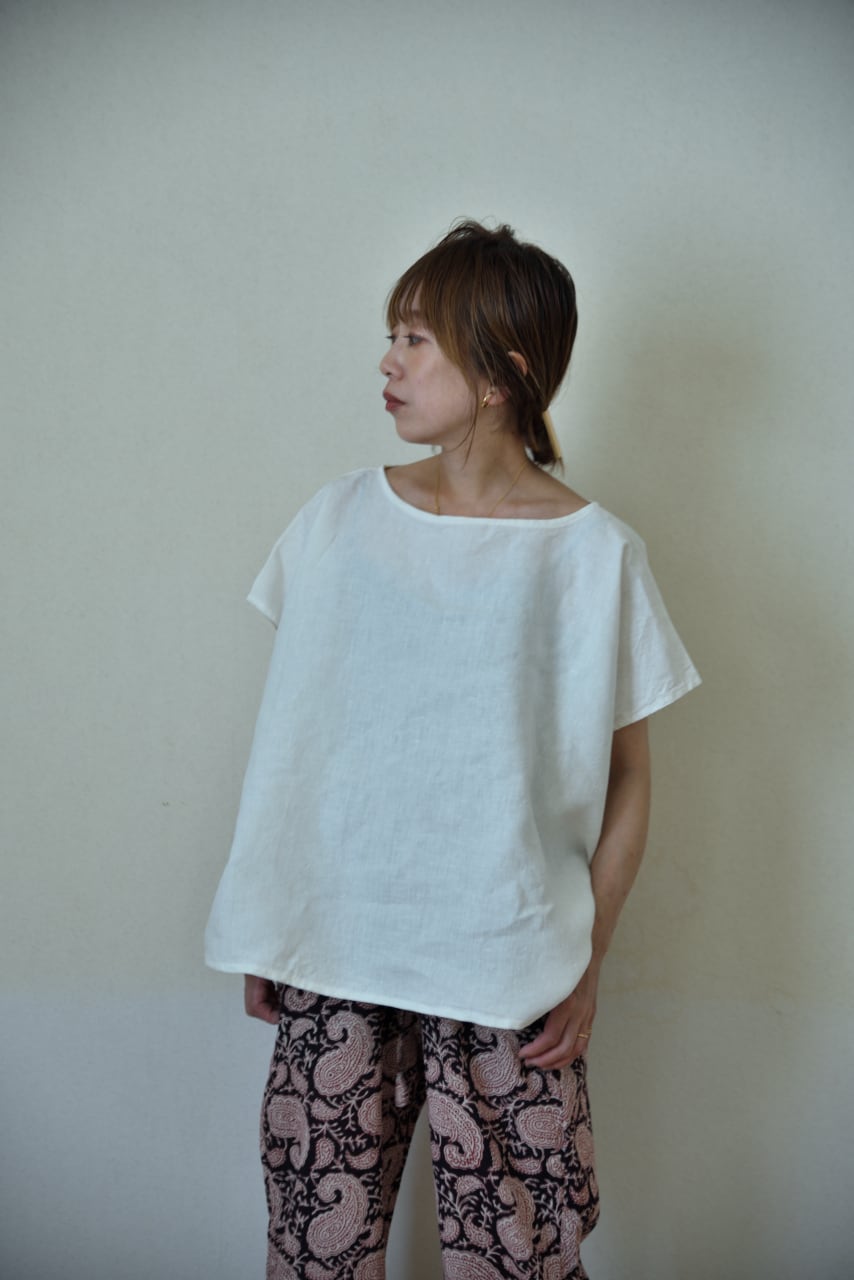 ゆったりとしたスクエアラインは、風通しが良く涼しく着られます。秋からは長袖のカットソーやタートルとの重ね着も楽しみなデザインです。