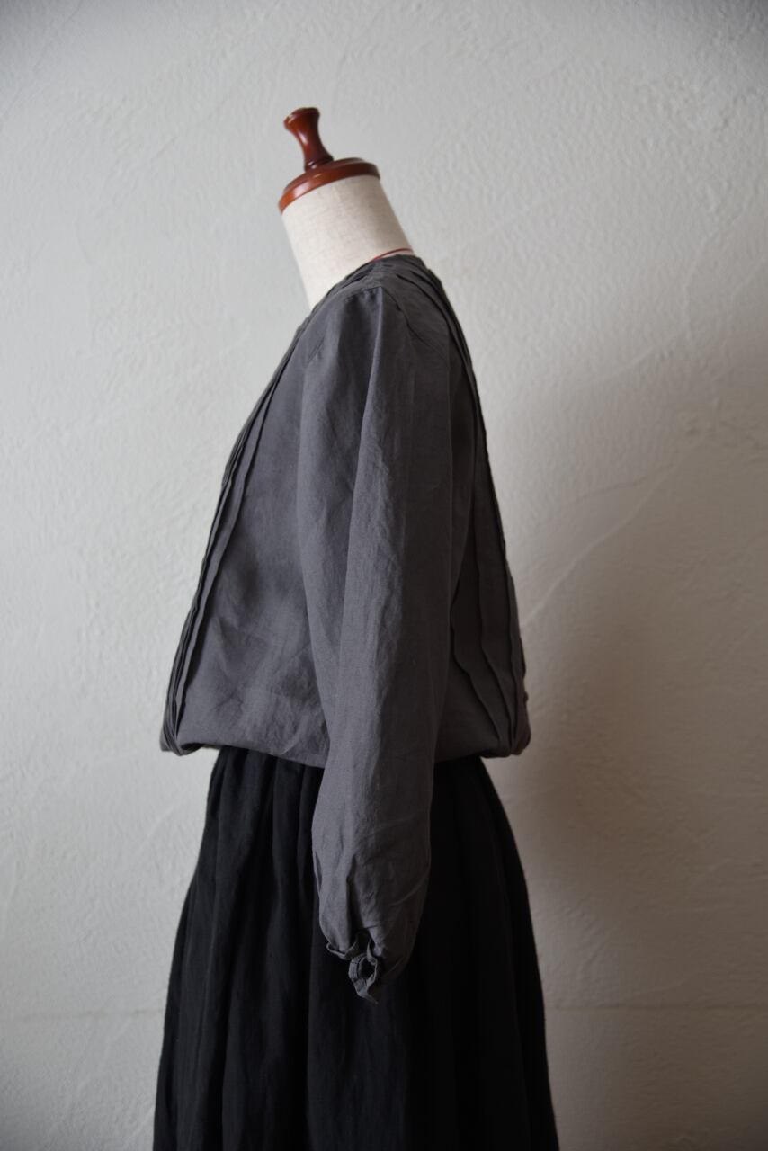 高密度のプラットエアーイン加工リネン(生地を長時間もみほぐし染めに時間をかけ、優しい肌触りにする加工)を使用した、ピンタッククラシカルブラウス。