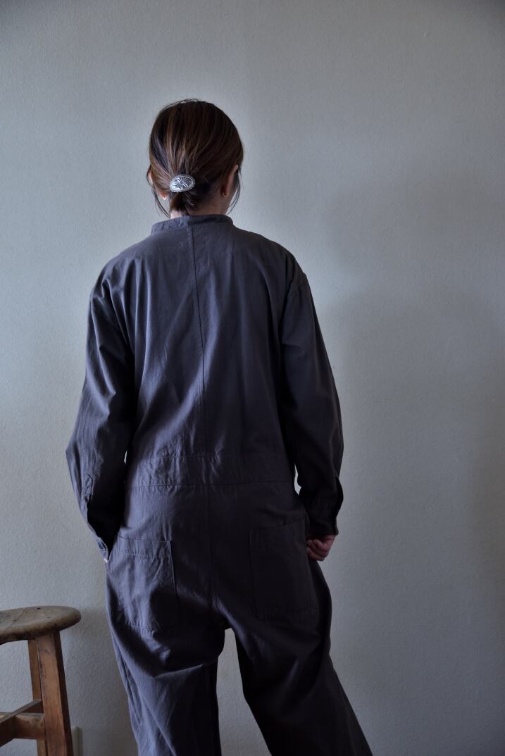 張りのあるコットンを使用した、ワークタイプのジャンプスーツ。スタンドカラーにしたことで、ワーク感を程よく抑えています。